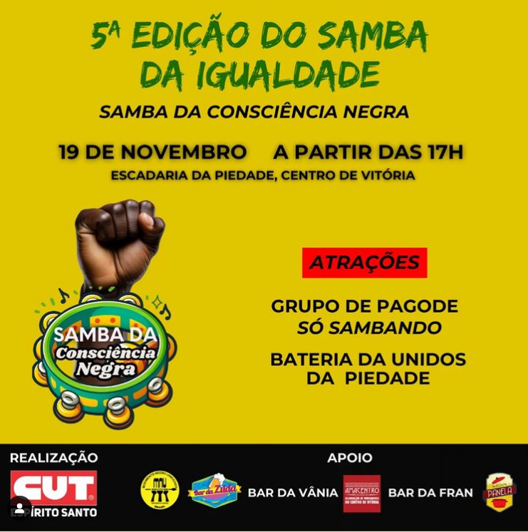 14/11/2024 - CUT-ES realizará a 5° edição do Samba da Igualdade, o Samba da Consciência Negra.