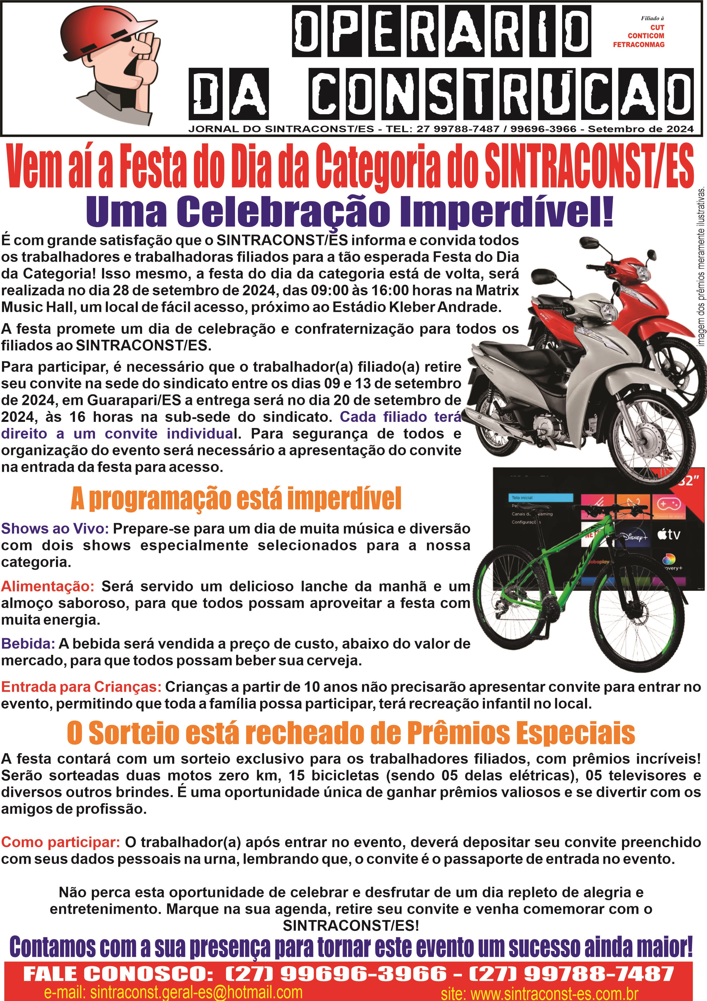 continuar a leitura12/09/2024 - Vem aí a Festa do Dia da Categoria do SINTRACONST/ES, Uma Celebração Imperdível!