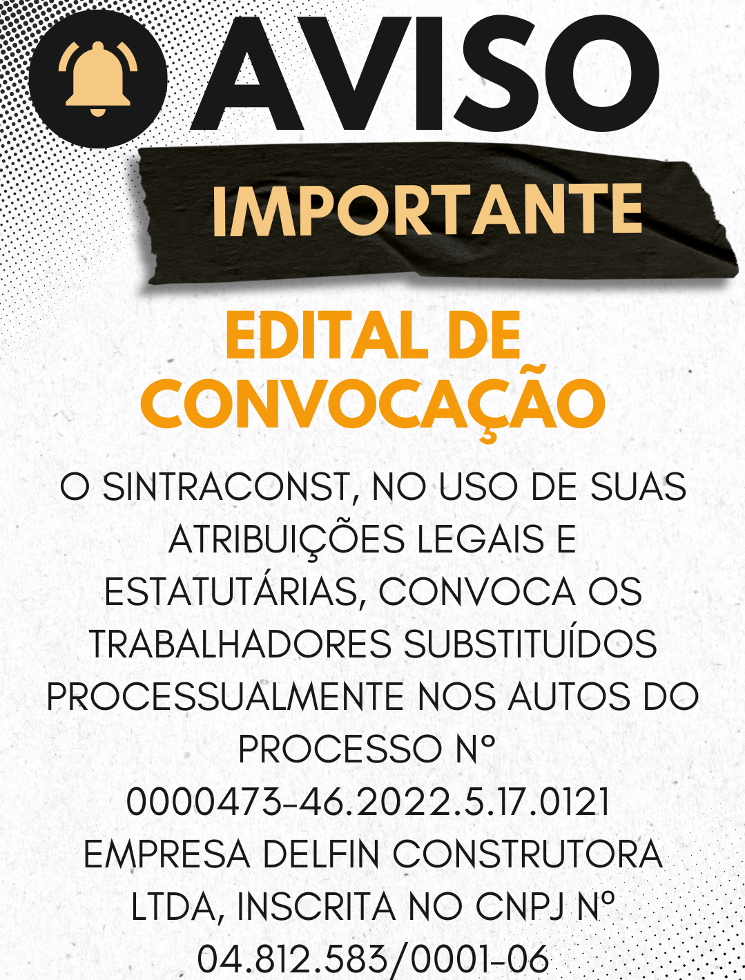 SINTRACONST, no uso de suas atribuições legais e estatutárias, CONVOCA os trabalhadores substituídos processualmente nos autos do processo n° 0000473-46.2022.5.17.0121 da empresa DELFIN CONSTRUTORA LTDA, inscrita no CNPJ nº 04.812.583/0001-06, para comparecerem à Assembleia Geral Extraordinária, a realizar-se no dia 10/08/2024 as 07:00 horas em primeira convocação e as 08:00 horas em segunda convocação, na praça Augusto Ruschi, Centro, Santa Teresa/ES, CEP: 29.650-000, para deliberarem sobre a proposta de acordo entabulada nos autos do processo acima, sem redução dos valores a que tem direito e parcelamento em no máximo 6 (seis) parcelas.